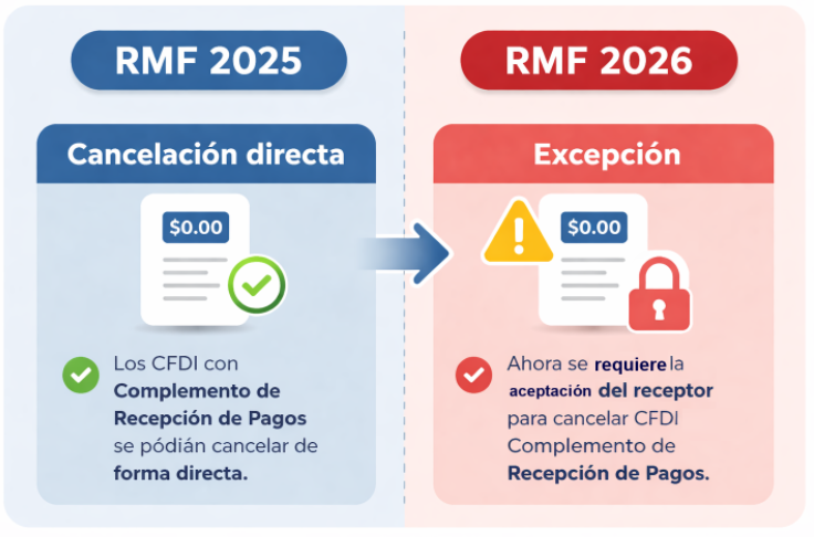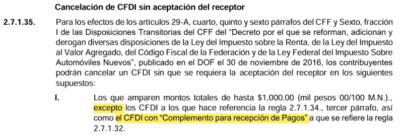 En la actualización publicada el 28 de diciembre de la Resolución Miscelánea Fiscal, misma que tiene vigencia a partir del 01 enero 2026, podemos encontrar una modificación al párrafo I de la regla 2.7.1.35, en la cual se incorpora una excepción para los CFDI con Complemento para Recepción de Pagos, dejándolos fuera del supuesto de cancelación sin aceptación del receptor: