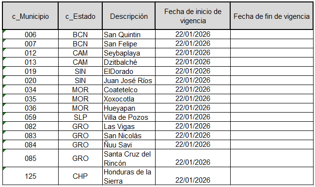 - Se actualizan 93 claves correspondientes a municipios relacionadas a diferentes claves de CP