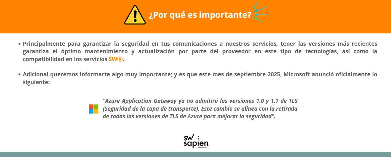 En SWⓇ nos interesamos por tu seguridad y que siempre estés actualizado en las mejores prácticas con el uso de la tecnología. por ello queremos retomar nuestra campaña de actualización iniciada el año pasado e invitándote a verificar la versión del protocolo que estas utilizando para proteger tus comunicaciones y estés trabajando con la versión TLS 1.2 o mayor.