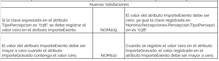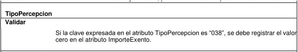 - En el atributo TipoPercepcion se incorpora una validación adicional para el uso de la clave 038 (Otros ingresos por salarios.)